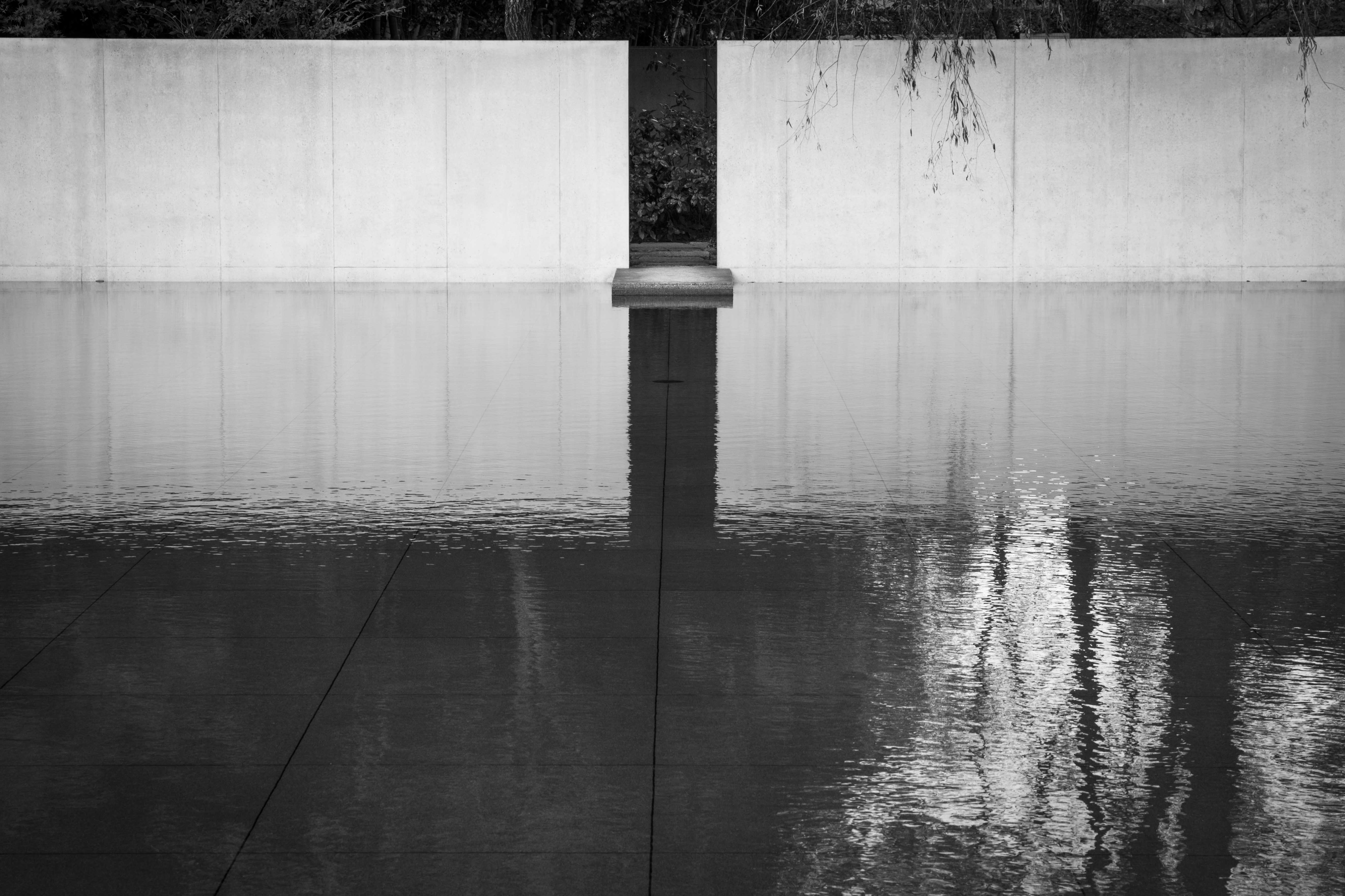 Every couple of minutes ripples are generated in the water mirror garden and they slowly expand across the water at the D. T. Suzuki Museum.