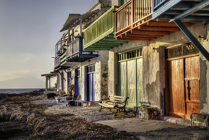 Colorfully painted boathouses at Klima reflect the orange late-day sun.