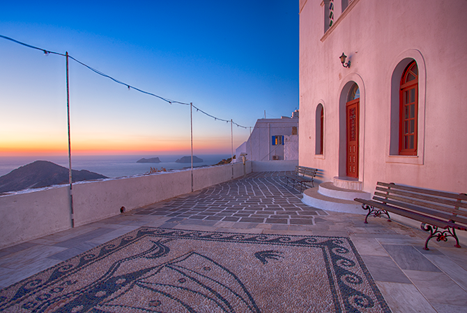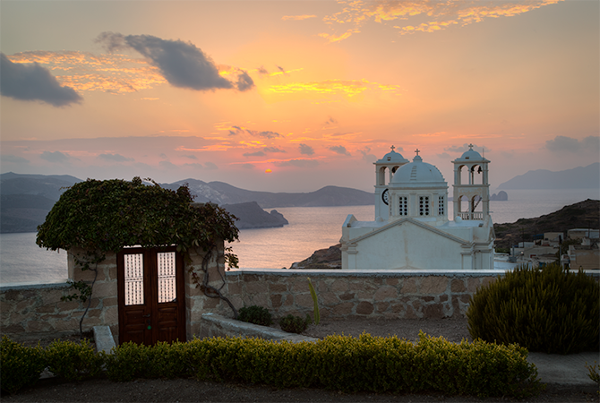 This Milos Church overlooks the sea and the sunset.