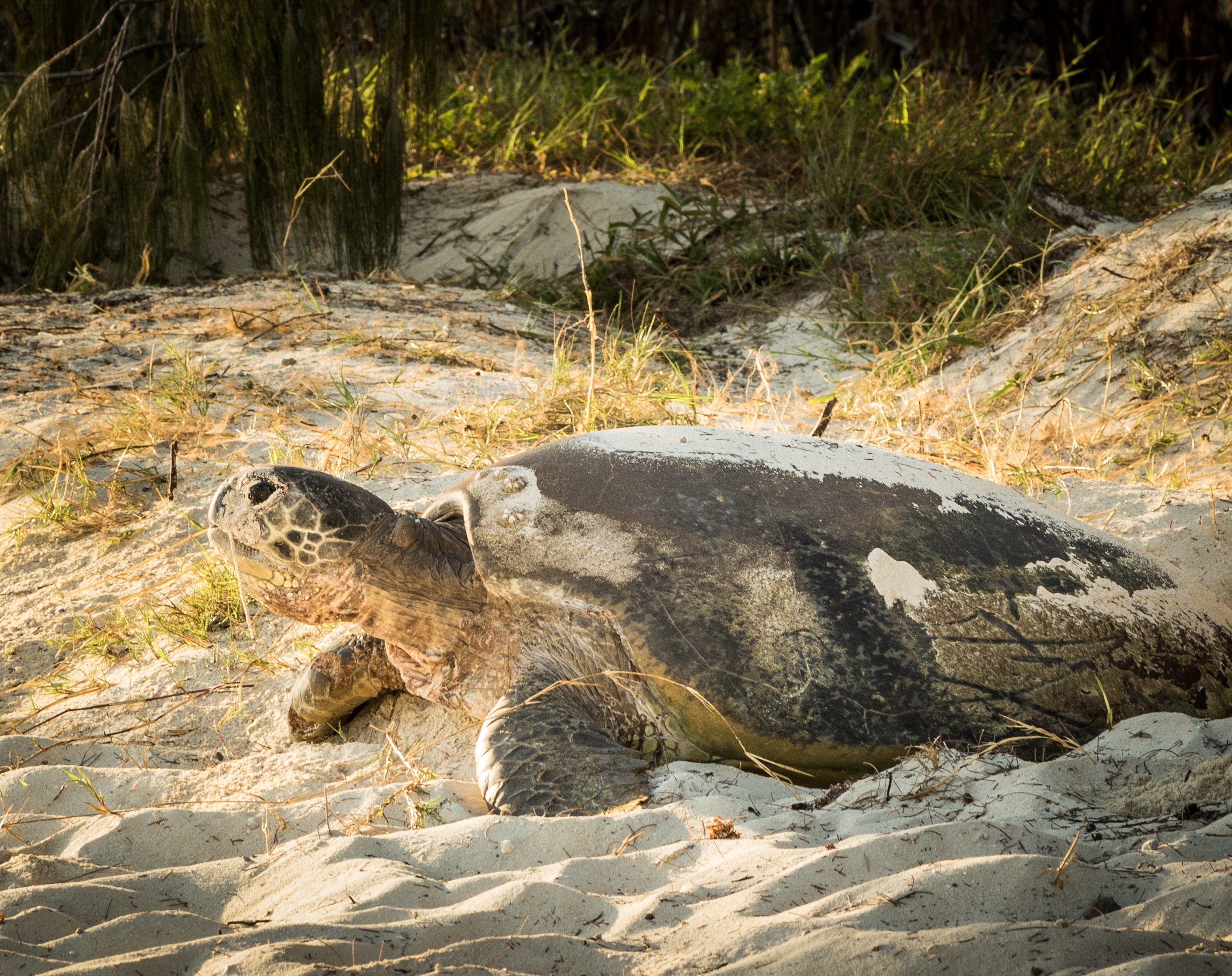 On our last day on Heron Island, Joanne and I got up at 4 am to do a moonlit beach walk. October is the start of sea turtle breeding and egg laying season. Sea turtle beach tracks look like the single print from a Caterpillar tractor driving up from the water, landing craft style. In the dim light of a waning gibbous we came upon a turtle track ascending from the water’s edge, grinding its way 50 yards to the tree line. There she dug. We watched well away from her, behind some driftwood, for two hours until she finished and made her beleaguered way back to the water. These turtles are not built for land travel and the egg laying process is so depleting that they can only manage it every two years. “Our” turtle slogged seaward for a few yards and then plopped, head down, in the sand to rest. After a minute or two she recuperated and then recaptured a few more yards back toward the safety of the ocean.