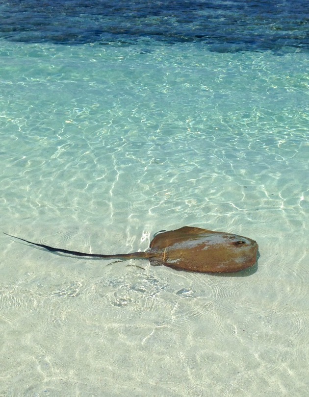 A baby shovel-nosed ray swims close to Joanne’s foot in a sandy tidal pool. We snorkeled with the seven foot adults.