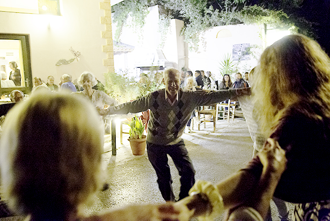 Dancing into the night. It is midnight and the party is just getting started. Ikarians live long and enjoy life.