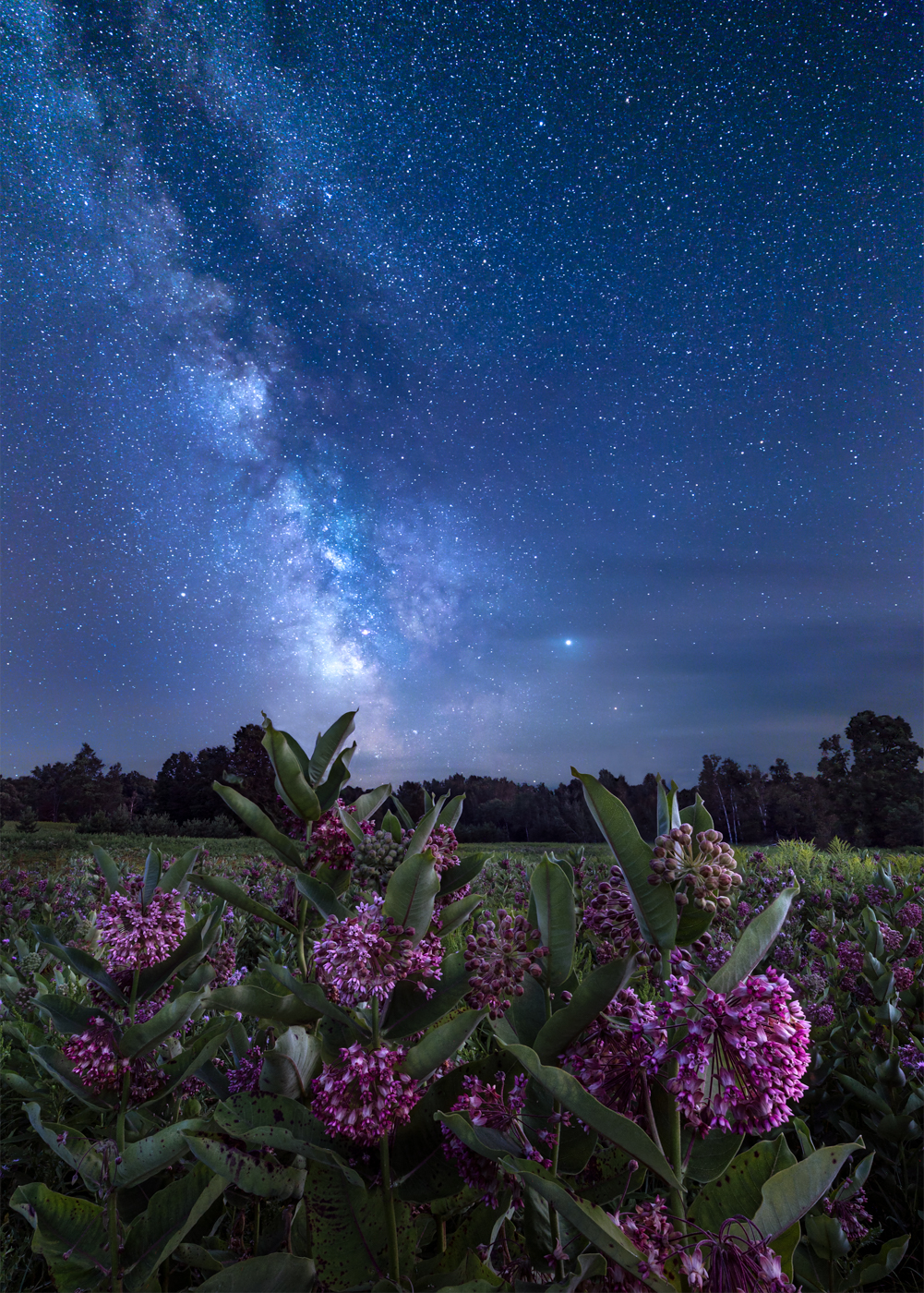 The milky way galaxy above a field of milkweed plants.