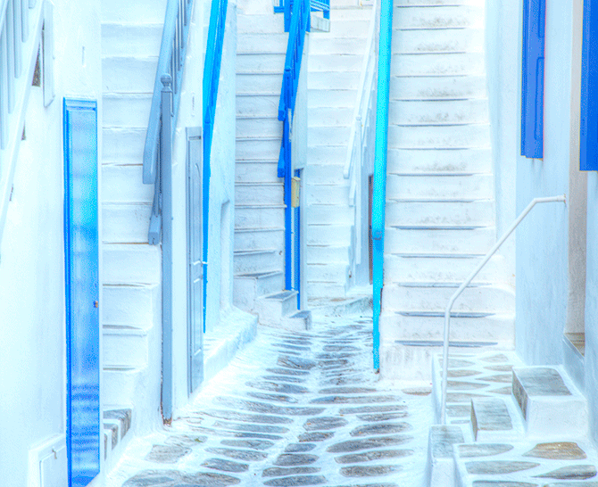 Mykonos town is a labyrinth of narrow streets and alleys whitewashed and accented with bright colors. I liked the abstraction the stairs made.