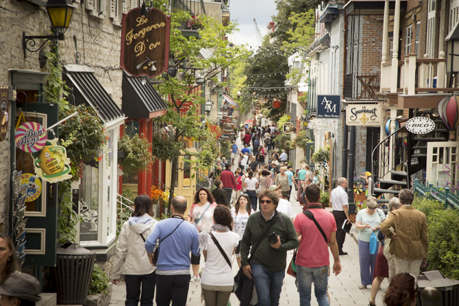 Approaching Quebec City by car you start to notice that road signs are all in French, no English. Down the road toward Montreal the signs did double language duty, but here it’s “en Français” only. Quebec license plates say “Je me souviens” or “I will remember.” I don’t know what they remember but I will remember that a “rue” is a road and that there is a lot of seasonal rue construction and collectors (ramps) are easy to miss. Thankfully our English-speaking GPS prevailed and we were soon through the gate in the city wall and rattling down the cobblestone rues of Vieux Quebec (Old Quebec).