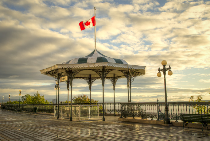A crisp morning breeze snaps the Canadian flag on one of the Victorian era gazebos of Dufferin Terrace. This boardwalk is a great place to get an overview of the city and the St. Lawrence River below.