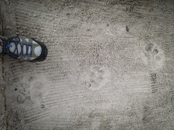 Wildlife gets the right of way. Lion tracks on soft soil at Xigera Camp indicate the cat was in camp the night before.