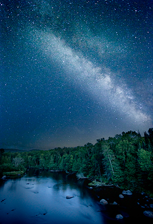 The images that RAM selected are from my Wolf River Project. I’m still completely captivated by this river and get out to photograph every chance I get. Fortunately our cabin in Central Wisconsin is only a few miles away from several of the best stretches. Every season is different, every time of day or night reveals new beauty. This summer, I’ve been trying some night photography and that’s has proven to be quite a challenge. Scouting the location ahead of time is critical because climbing through the dense brush at river’s edge in the middle of the night can be exhausting and potentially dangerous. Then there is the matter of getting the stars exposed properly and getting the light balanced with the river. It amazes me how digital cameras can capture such detail in the night sky. My first attempt is pictured below.